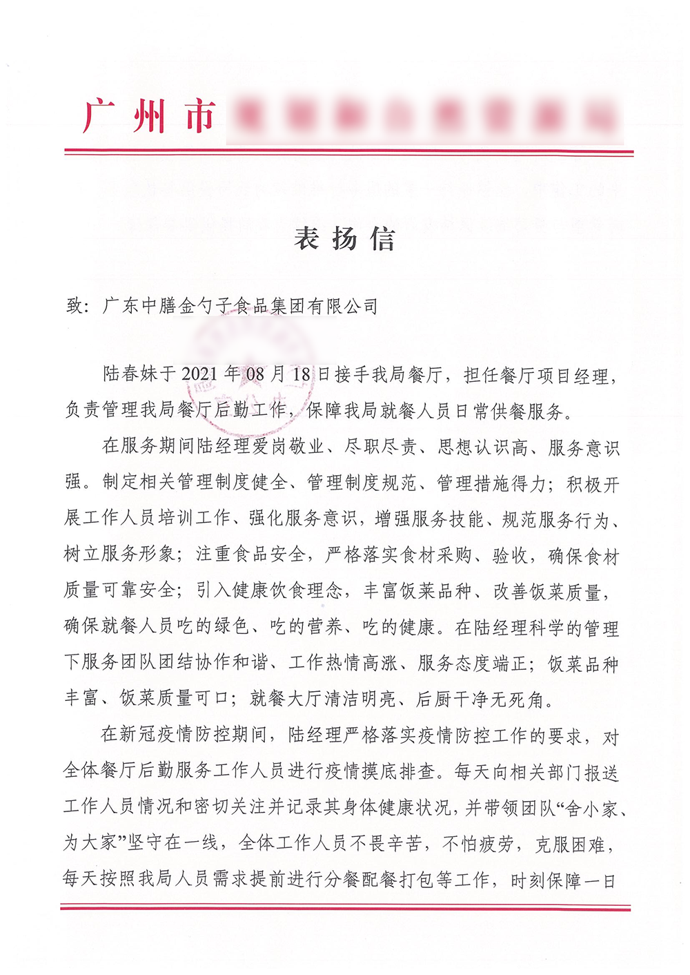 12月22日,一封来自某医院职工食堂的表扬信,其中写到“在疫情形势严峻的情况下,能根据我方的实际情况制定合适的服务方案”,“我方对广东中膳金勺子食品集团的餐饮服务各方面综合评价为优秀!”