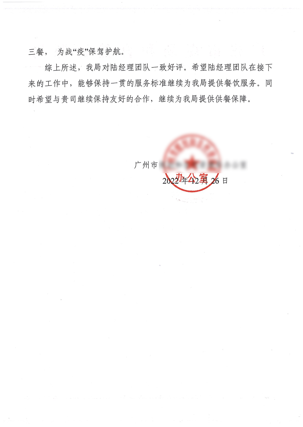 12月27日,某局机关单位食堂后勤部对我司表示感谢和表扬:面临新冠疫情以来最复杂、最严峻的防控,“贵公司项目组和工作人员能主动担当,坚守工作职责,做到食材供应可溯源、烹饪制作生产有保障、厨具餐具清洁消毒到位、设备保养维护尽责,食品卫生安全可靠。”