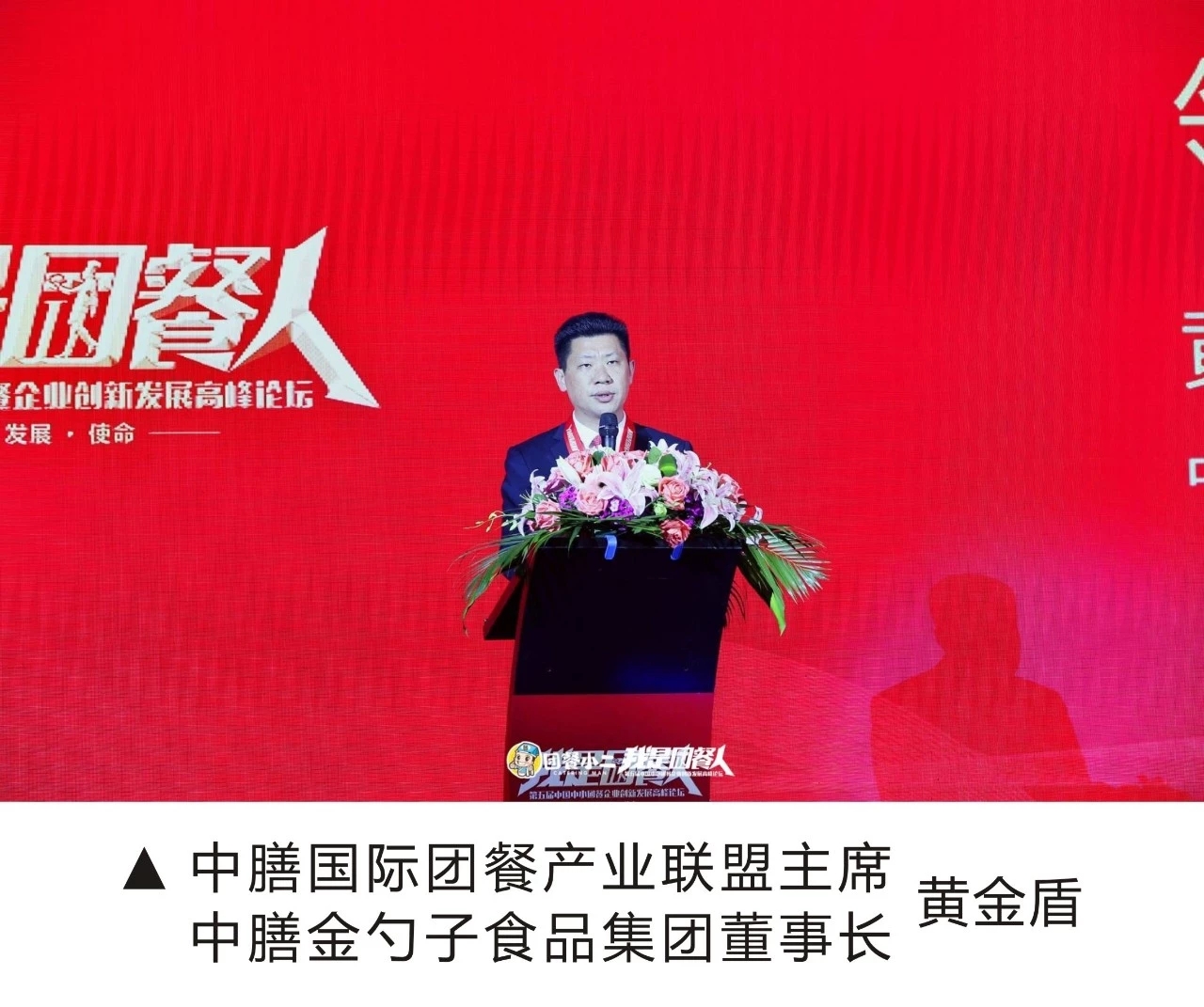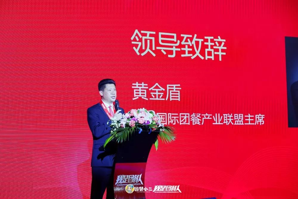 答谢晚宴上,中膳国际团餐产业联盟主席、中膳金勺子食品集团董事长黄金盾,就团餐行业的责任、发展、使命做了总结致辞: