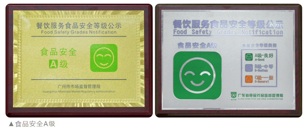 经装修升级后,金勺子餐饮项目704门店环境舒适优美、食品留样食品检测、后厨标识清晰、工具摆放到位、台账上墙、记录在册等,整体服务及食品安全管理水平较高,先后被广东省食品药品监督管理局和广州市市场监督管理局授予“食品安全A级”荣誉。