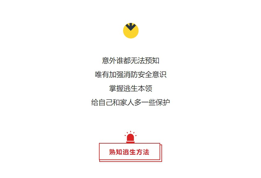 3、如遇火情,不要贸然开门,在打开门之前,要先用手背触摸门或把手,如果不烫,温度正常,表示火焰离你还有一段距离。可以打开门缝,观察楼梯间有无大量烟气,如果没有,就迅速从楼梯间向下逃生,通过楼梯间时要顺手关闭防火门,如果有,应立即退回室内,等待救援。 4、如果摸门或把手已经感到烫手,或有烟雾从门缝钻进,表示火焰可能已经靠近,千万不要开门,应退回室内,用衣物、床单被罩等浸湿后堵住门缝,泼水降温防烟,同时拨打“119”报告被困楼层和房间等重要位置信息,在靠近窗口的位置,通过打手电筒、挥舞衣物等方式发出求救信号,退守待援。 5、在逃生过程中,可佩戴防烟面罩或用浸湿的毛巾衣物捂住口鼻,要根据烟的浓度和高度采取相应的姿态进行逃生,如果火势正处于初起阶段,此时烟小火小,烟气层比较高,应该低头跑向户外。较低的时候必须弯腰低姿,那么再低的时候,需要沿地面、贴地面爬行,如果火势较大,楼梯间全是烟,这个时候绝对不能往外跑了,有湿毛巾也不能跑,应立即关门,防止烟进来。 6、身上着火,千万不要奔跑,可就地打滚或用厚重衣物压灭火苗,但滚动速度不要过快,否则不容易压灭火,也可以让他人端水来浇灭。 7、注意!在逃生时千万不可以乘坐电梯!起火时,普通电梯通常会处于断电状态,无法正常使用。且热烟气有时会以每秒3-5米的速度在井内向上猛窜,此时乘坐电梯,会瞬间被浓烟吞噬。 8、火场逃生的首要任务就是躲火避烟,若所有逃生线路被大火或浓烟封锁,切不可贸然穿越火海逃生,应立即退回室内,用打手电筒、挥舞衣物、呼叫等方式向窗外发送求救信号,等待救援。 9、高层住宅遇到火情时,绝不能盲目跳楼逃生!可利用疏散楼梯、天台等逃生,楼层较低,可以把床单、被套撕成条状连成绳索,紧拴在窗框、铁栏杆等固定物上,顺绳滑下,或下到未着火的楼层脱离险境。 10、逃生过程中,记得确保防火门为关闭状态,否则下层的烟气会顺着楼道往上蹿。还有不要在楼下围观,避免火灾引发高空坠物带来的伤害;已经逃离险境的人员,切不可贪恋财物、重返火场。 11、消防部门建议,居民最好在家中安装有火灾预警功能的独立式烟感报警器,配备简易灭火器、防烟面罩、多功能手电筒等应急逃生装备。 12、在公共场所的逃生提示 在商场等人员密集的场所,发生火灾时,最可怕的就是恐慌,发生推搡、踩踏的情况。所以,无论火灾大小,都应该尽量保持沉着冷静。只有这样,才能确保自己的判断力和观察力,才能在紧急情况下找到有效的逃生方法。同时,在疏散、逃生时也要注意方法,不要争先恐后用力推搡,应有序撤离,行走或跑步时要踮起脚尖,配合工作人员疏散引导。 当你入住酒店后,要了解自身所处的位置,熟悉最近通往安全区域的通道。入住酒店时先到安全出口看一看,熟悉路线,掌握好疏散距离和时间,倘若发生火灾,能在最短时间内准确无误地疏散至安全地域。 当公共汽车发生火灾时,要特别冷静果断,尽量从前门和后门逃生。若车门打不开,应砸开车窗跳车。用车上配备的安全锤,或用高跟鞋的鞋跟、皮带扣等,需全力往一个点上砸,正确方式是砸玻璃的四角,比较容易破碎。此外,公交车顶部一般都有“逃生窗”,平时当换气窗用,遇到危急情况时,可将其推开逃生。