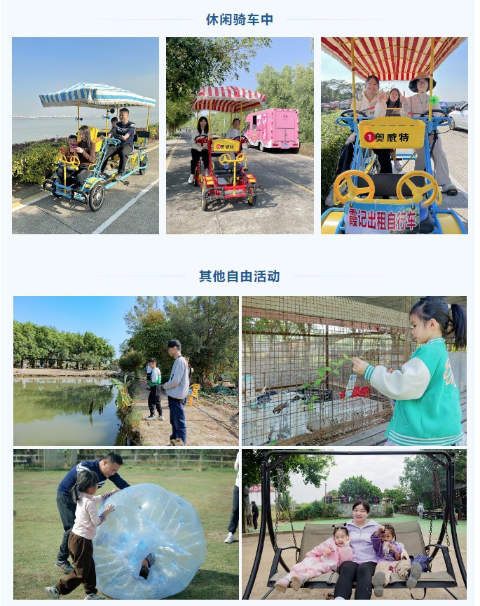 下午,大家在农场内自由活动。体验卡丁车、钓鱼、骑车游海鸥岛、捕鱼、打野战等丰富多彩的活动,享受大自然的恩赐,度过一段愉快的时光。
